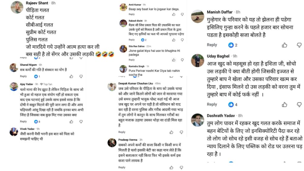उन्नाव रेपकांड में उम्रकैद की सजा काट रहे पूर्व बीजेपी विधायक कुलदीप सिंह सेंगर को सुप्रीम कोर्ट से बड़ा झटका लगा है। 29 दिसंबर को सुप्रीम कोर्ट ने कुलदीप सिंह सेंगर की जमानत पर रोक लगा दी। पर facebook पर कुलदीप सेंगर की बेटी इशिता और ऐश्वर्या सेंगर ने अपने पक्ष को रखते हुए एक मार्मिक पोस्ट किया है और अपने आप को विक्टिम दर्शाया है । इस पोस्ट के बाद एक बहस छिड़ गई है कि क्या सेंगर की बेटी की भी सुनी जानी चाहिए ??